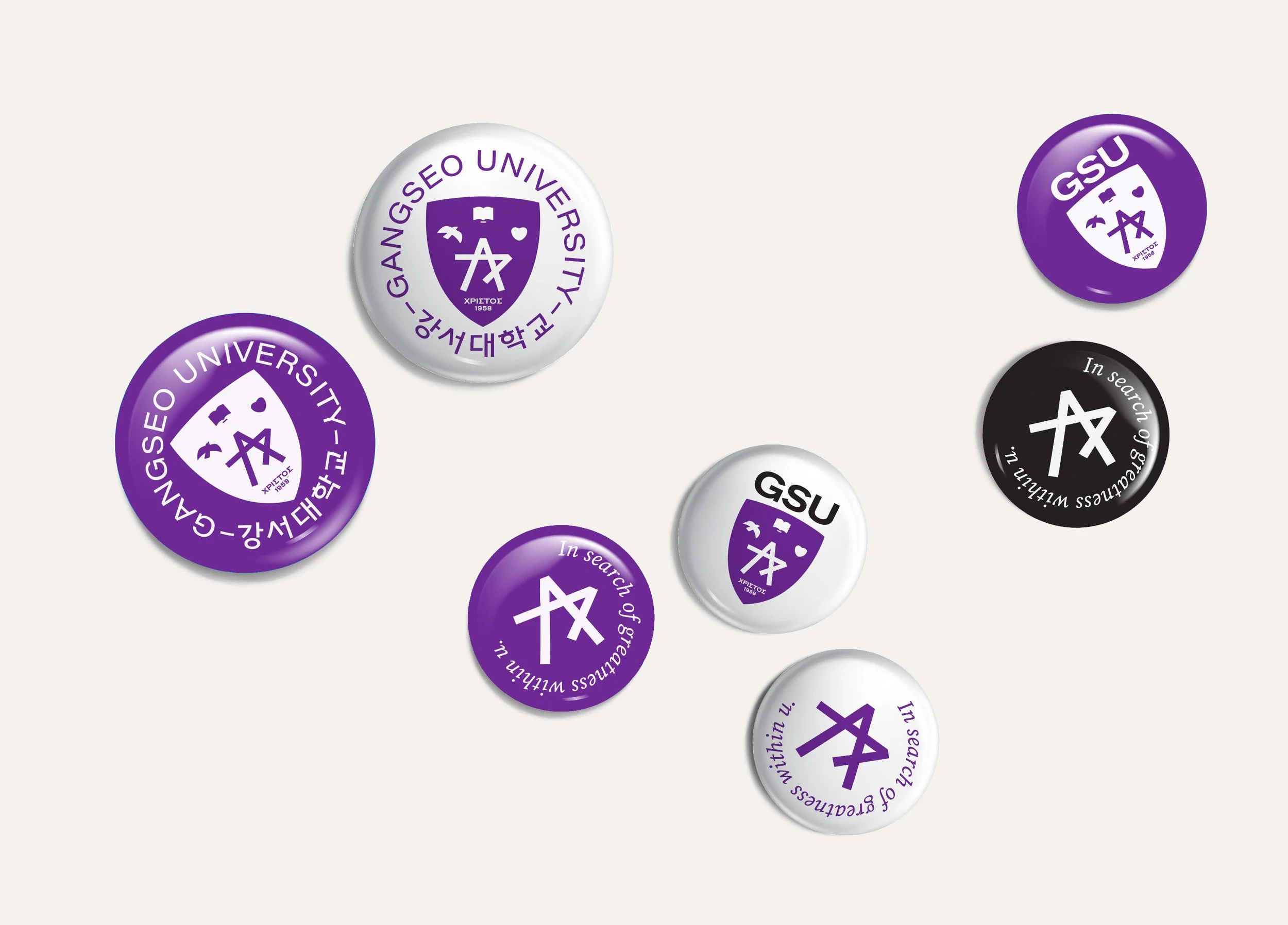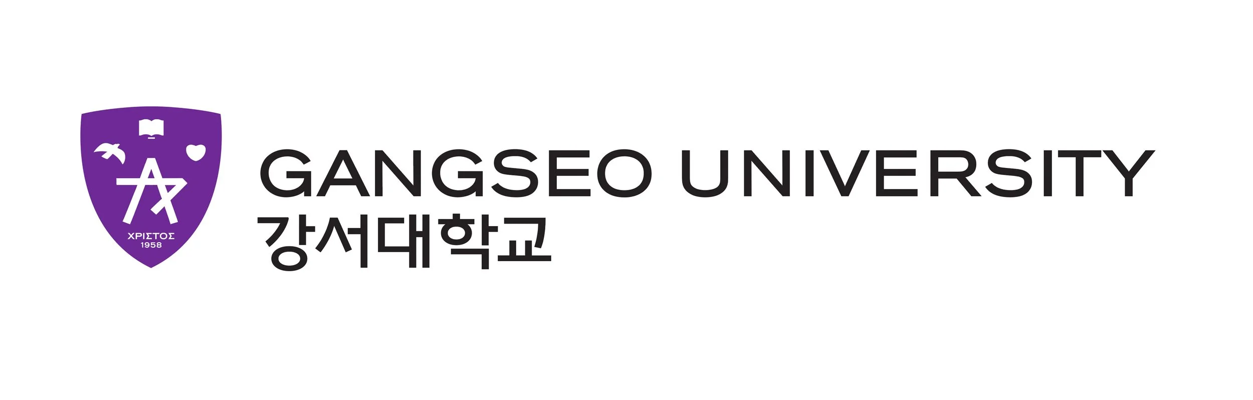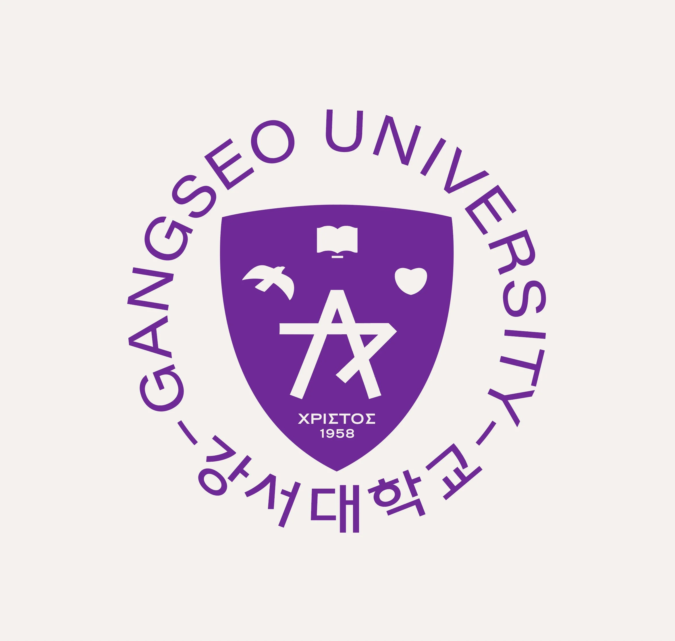 강서대학교의 UI는 ‘일치’, ‘자유’, ‘사랑’의 기초한 지식과 지혜로 깨우쳐 마침내 발견하게 되는 내 안의 ‘별(Greatness)’을 의미합니다. 일치(진리), 자유, 사랑의 각각 상징하는 책, 새, 하트의 상징 아래 강서의 초성인 ‘ㄱ’과 ‘ㅅ’이 만나 별을 이룹니다. 방패는 이러한 가치를 수호함을 의미합니다. UI의 컬러는 본질에 일치(White), 비본질에 자유(Blue), 매사에는 사랑(Red)을 상징하는 컬러가 합쳐져 탄생한 보라색(Purple)을 사용합니다.